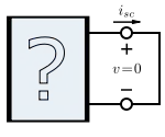 When the above circuit (the Norton Equivalent Circuit, after Bell Labs engineer E.L. Norton) is disconnected from the external load, the current from the source all flows through the resistor, producing the requisite voltage across the terminals, voc. Also, if we were to short the two terminals of our circuit, the current would all flow through the wire, and none of it would flow through the resistor (current divider rule). In this way, the circuit would produce the short-circuit current isc (which is exactly the same as the source current is).