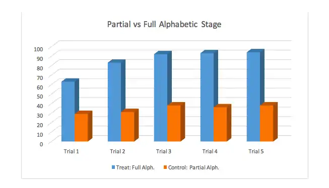 To show the difference in the phases of reading a study was conducted by Ehri and Wilce in 1987. This study was done to show the differences in sight word learning between full and partial stage readers [52]. For this study, kindergartners who were already in the partial alphabetic stage were randomly selected. They then were randomly assigned to a treatment or a control group. The treatment group then received training to become full alphabetic stage readers by having them practice reading similarly spelled words. This required processing all the grapheme-phoneme relations in the words to read them correctly. The control grouped received no training what so ever and remained as partial stage readers. Following this, both groups of kindergartners got practice learning to read a set of fifteen words over several trials. All the words in the list had similar spellings which made it harder for children to learn by remembering partial cues. The list of words included words such as spin, stab, stamp, or stand. Before the study none of the children could read more than two of these words prior to training.
