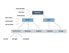 What are schemata? Schemata are believed to be mental representations of an individual’s general cause and effect knowledge.[8] Any and all knowledge that we gain is organized in the schema, which is responsible for the subsequent encoding, storage and retrieval of information.[1] Schemata are formed through the interaction of the external conditions and the individual’s own prior knowledge.[9] The image on the right can be a representation of schemata for knowledge about mammals.