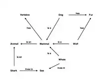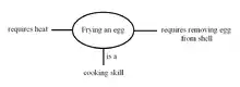Declarative knowledge is encoded, stored, and represented in chunks, or individual units of human memory that resemble schemas (knowledge structures). Each chunk contains propositions or descriptive features about the subject item, stored in slots,[30] including what larger category it belongs to. Chunks can be represented either in a textual or graphical format.[34] For example, a chunk about frying an egg might be textually represented as: frying an egg is a type of cooking skill; requires the egg to be removed from its shell prior to cooking; requires heat. To the right is a possible graphical representation of a chunk.