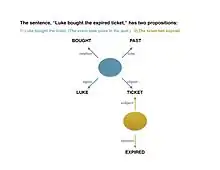 Propositions are the mental concepts in which most theorists widely believe that we store linguistic information and the majority of our declarative knowledge.[1] Propositions are known to be the absolute shortest statement to which meaning can be attached, yet are inherently more complex than concepts as they build upon the preexisting concepts in order to form meaningful statements and assertions how these particular concepts are related.[6] In order to be a proposition, the statement made must be able to be judged to be either true or false (in other words, a declarative statement of knowledge).[7] Here is an example of a sentence that contains two propositions: “Luke bought the expired ticket.”