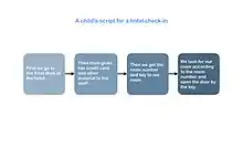 Scripts are the mental concepts that work as the underlying framework for all our procedural knowledge.[1] It is commonly agreed that scripts are vital to our social understanding of the world around us, and largely work to provide information governing social situations and events, specifically who does what, when do they do it, to whom they do it and why.[14] People use scripts in many kinds of events such as checking into hotels. Scripts develop over time and with continuous exposure to recurring events that are all essentially similar in nature.[1] For instance, you might develop your own script of how to check into a hotel over time, and it can help you to organize, remember things, as well as react to the possible upcoming events in the situation. The figure to the right is a child’s script for a hotel check-in.