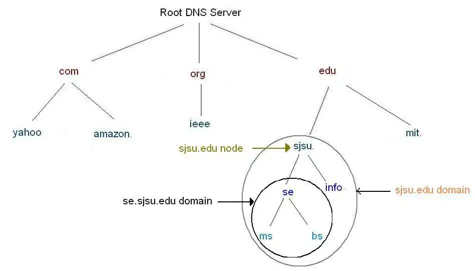 As discussed earlier, each domain name is made up of a series of character strings (called "labels") separated by dots. The right-most label in a domain name is referred to "Top-Level Domain" (TLD). Every TLD includes many second-level domains E.g. sjsu.edu. Every second level TLD may include number of third level domains. E.g. se.sjsu.edu. This process can go on.