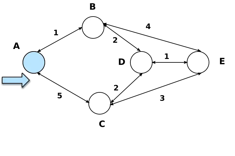 Initially, each node sets a cost of 1 to its directly connected neighbors and infinity to all the other nodes. Below is shown the initial routing table at node A: