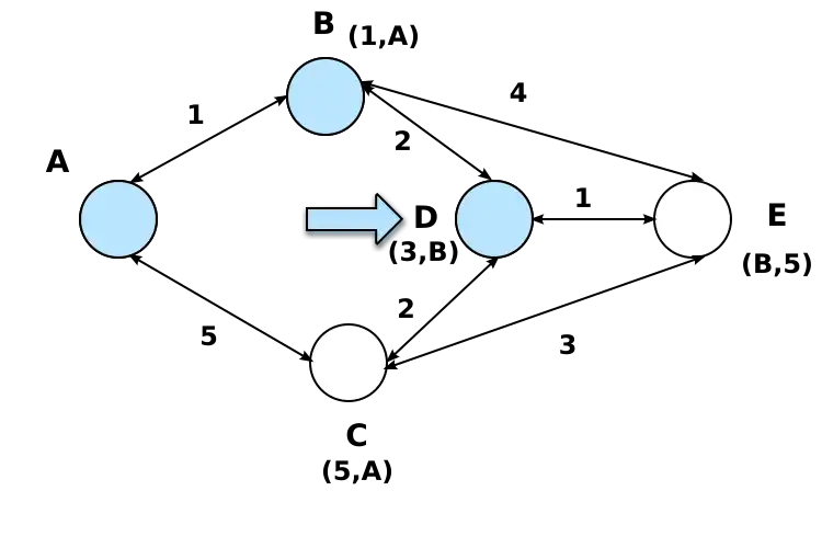 C views B as the best route to D, with cost 1 + 2, so C sends new vector to B. B learns that its former choice for sending to D via C now has higher cost, so B should recompute its vector.