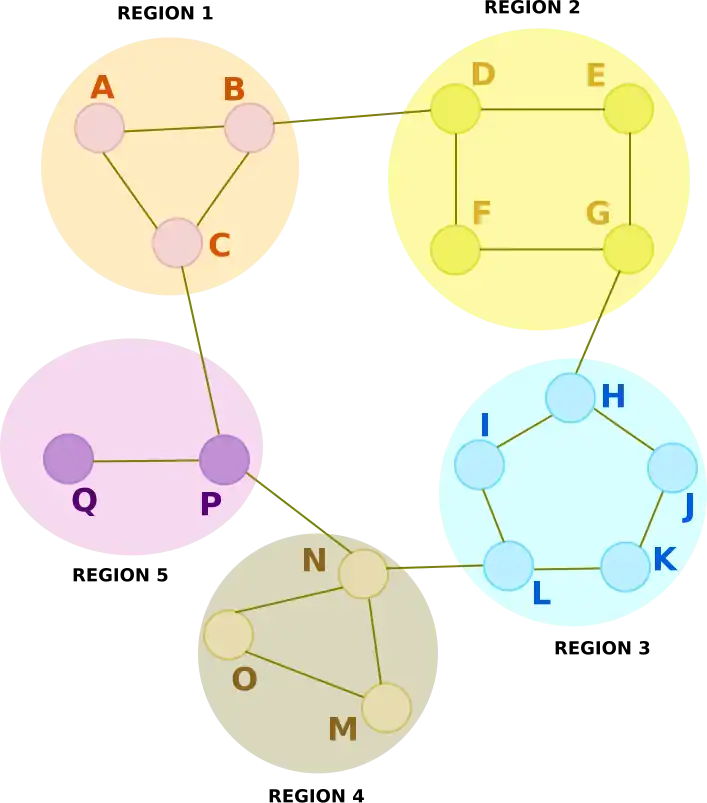 In hierarchical routing, routers are classified in groups known as regions. Each router has only the information about the routers in its own region and has no information about routers in other regions. That way, routers just save one record in their table for every other region. In this example, we have classified our network into five regions (see below).
