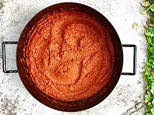 Ajvar (Macedonian Cyrillic: Ајвар) is a type of Macedonian relish, made principally from red bell peppers. It may also contain eggplant and chili peppers. Can be consumed as a bread spread or as a side dish.