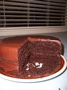 - Immediately 'frost' the cake with this, and make sure that there is quite a bit between the two layers of cake. The cake will need to be refrigerated to harden the fudge, so don't worry about its relatively liquid nature.