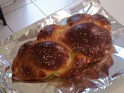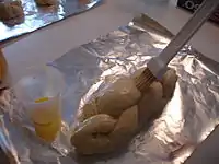 - ↑ Weight conversions from USDA National Nutrient Database. Original recipe text and ingredient order preserved. Used "1/2 cup plus 1 tbsp" for sugar conversion. Active dry yeast, large eggs, and soybean oil presumed. Density adjustment not applied to warm water.