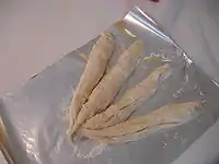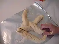 - Take one part. Separate it into four pieces. Take each piece and roll it between your hands until it is a long strand. Attach the four strands together at one end by squeezing the ends together. See picture.
