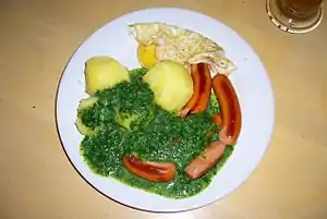 Creamed spinach makes a nutritious sauce that goes well with fish and meat dishes. In Swedish cuisine it has traditionally been used with boiled potatoes and fish or with chipolata, the Swedish "prince-sausage".