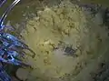 - Put the bowls back together, and beat with the wooden spoon until the mixture has changed colour and texture.