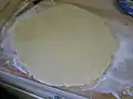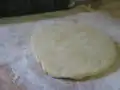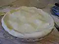 - On a lightly floured board, roll each half out until it will cover a 20 cm (9 inch) pie dish, with about 2 cm (3/4" inch) overhang.