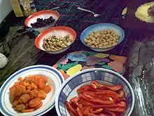 - Put 1 Tsp of Sauce in the middle. Put 1½ Tsp of shredded vegetables over the sauce. Put 2 olives and 2 capers, one on each corner of the dough. Keep placing the rest of the fillings as in a collage: 1 tsp. of vine fruit, 1 prune, 2 tsp. of pickles, 1 Tsp of chickpeas, 3 cubes of mock duck, 1 asparagus, 2 strips of grill pepper and some leaves of parsley.