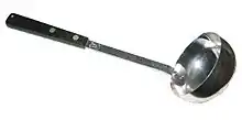 A large spoon-shaped utensil with a long handle used for transferring soups, stews and other liquid or semi-liquid foods from one container to another, as from a cooking pot to a bowl.