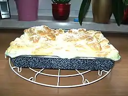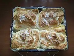 - butter two oven-proof dishes (you may now line the bottom of the dish with jam or custard)
