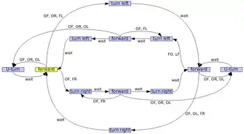 At this moment, you know how the program uses an FSM for creating a robot behavior. An FSM can be formalized mathematically. Moreover, there is a theory behind this concept: the automata theory. FSM is only a part of this theory. You can find there other kinds of automata. For example, a probabilistic automaton has probabilities on its transitions. So, a state and fixed sensor values may have different next states. For more information about this topic, you can refer to: