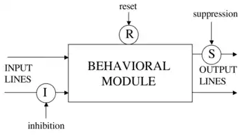 The external structure of a module is shown on the figure. A module receives input values directly from the sensor or from another module. These values can be inhibited by another module. Similarly, the output values are directed either directly on an actuator or on another module. Finally a module may have a reset function.