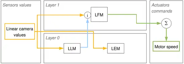 - LEM: Its role is to remove the inhibition on the LFM when it detects a black line. Moreover, it has to inform the WFM that is has to stop following the wall.
