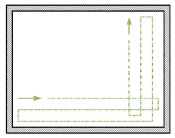 Another solution for performing an exhaustive coverage is to ”scan” the area as depicted in figure. Firstly, a horizontal scanning is performed, and then, when the robot has no more possibilities to go on, a vertical scanning is performed. The corresponding automaton is depicted in the next figure. This automaton is the biggest you have seen until now.
