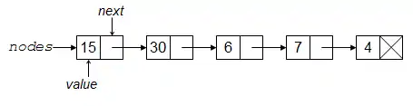 Note that when we iterate the numbers in the chain, we are actually looking at them in reverse order. For example, assume the numbers input to our program are 4, 7, 6, 30, and 15. After EOF is reached, the nodes chain will look like this:
