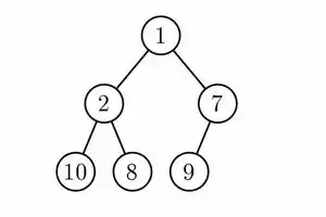 (This property applies for a min-heap. A max heap would have the comparison reversed). What this tells us is that the minimum key will always remain at the top and greater values will be below it. Due to this fact, heaps are used to implement priority queues which allows quick access to the item with the most priority. Here's an example of a min-heap: