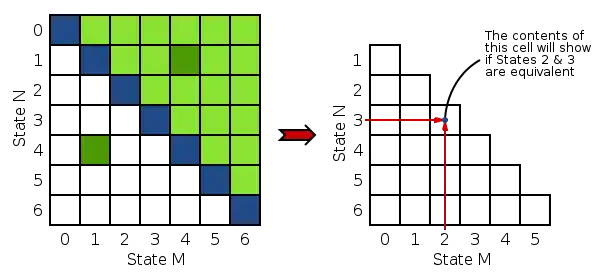 - The next stage is to go through the chart again. This time we look at the state pairs listed in every unmarked cell. Consider each of the next-state pairs separately. If the cell representing the next-state pair has been marked, mark the current state also (you may have to reverse the order of the states). If any of the next state-pairs are not equivalent, the current state cannot be equivalent. If the cell contains an entry "i−i", ignore it, as a state must be equivalent to itself. For example: