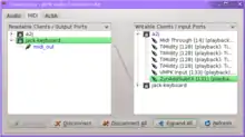 Also click the “Connect” button, and another window will appear, showing the connections between JACK client applications. This will have 3 tabs, labelled “Audio”, “MIDI”, and “ALSA”. The “Audio” tab will show the connections for routing audio data, while the “MIDI” and “ALSA” tabs will show two different kinds of connections for routing MIDI data. Applications that use ALSA calls to manage their MIDI interfaces will show up under the “ALSA” tab, while those that use native JACK calls will show up under “MIDI”.