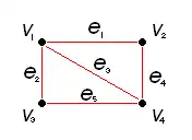- f such that e1 maps to {v1, v2}, e2 maps to {v1, v3}, e3 maps to {v1, v4}, e4 maps to {v2, v4}, and e5 maps to {v3, v4}.