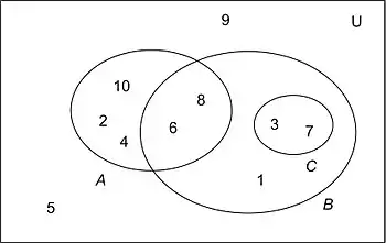 A ∪ C = {2, 3, 4, 6, 7, 8, 10} A ′ = {1, 3, 5, 7, 9} B ′ = {2, 4, 5, 9, 10} B ∩ A ′ = {1, 3, 7} B ∩ C ′ = {1, 6, 8} A – B = {2, 4, 10} A Δ B = {1, 2, 3, 4, 7, 10} |