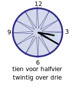 3:20 twintig over drie(reference past the whole hour; not used everywhere),