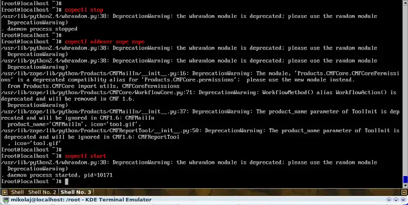 zopectl stop (to make sure Zope is stopped for adding a user) zopectl adduser zope zope zopectl start
