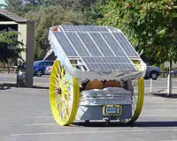 Suitable for educating youth in the technologies of electric vehicles, technically advanced versions of the cart can exhibit high efficiency in energy use and are a natural prelude to later developing pure solar electric racing vehicles or the conversion of ICE vehicles to electric drive. Speeds are typically limited to about seven MPH so a running adult can overtake and stop a vehicle. Some classes allow a great freedom in design by having a class first disassemble the previous constructions, returning components to appropriate bins. This disassembly task informs the students on design methods and equipment assembly. The students, in small teams, then design and construct new vehicles.