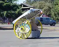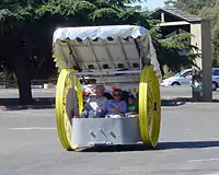 A novelty vehicle or an electric powered art car may not be suitable for on road use. Applications include electric vehicle show demonstrations, parades, parade floats, float towing, and eclectic off-road gatherings such as Burning Man.
