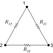 The above image shows three points 1, 2, and 3 connected with resistor R12, R23, and R31. The configuration is called a delta network or delta connection.