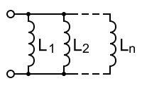 When inductors are in parallel, then each inductor has the same voltage across it, that is, the voltage present at the terminals of the network. This can just be called v. Now, our equation describing the equivalent inductance, Leq, is: