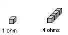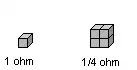 The resistance of a material is inversely proportional to its cross-sectional area. This is shown in the diagram below, where 1 unit cubed has one ohm of resistance. However, if 4 units cubed are stacked on top of each other in the fashion such that there is 4 units squared of cross-sectional area, and the electrical connections are made to the front and back such that the connections are on the largest sides, the resultant resistance would be 0.25 ohms.