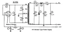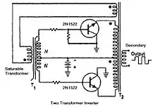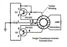 When semiconductors came into being, large PNP type Germanium transistors were used, like the 2N1522, and their bases were connected to a "tickler" winding on the transformer, which was out of phase with the primary, and supplied around 5 VAC (Square Wave) for bias. The tickler winding would set up the oscillation of the circuit, and relied on core saturation to work. The transistors then took the place of the vibrator, and created a square wave input to the primary of the transformer; some ran at higher frequencies. Since the transformer relied on saturation, a core with an interleaved stack was used. In some instances, toroidal transformers were used, made by winding a continuous strip of electrical steel into a dough-nut shape. The transformers coil was then wound over the toroid using a special winding machine.