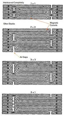 The core can be stacked in two different ways when using steel laminations. The most common is the interleaved fashion where each lamination is staggered opposite to the other (turned 180 degrees opposite the other). This provides for the least amount of air gap in the core, and the highest efficiency. The other way is butt stacked. In this way, all the E type lams are stacked on one side, and all the I type lams are stacked on the other. This way though creates an air gap where the butt joint is created thus increasing the losses. However, when a DC current is superimposed on an AC current as in an audio transformer or filter choke, the air gap can stop the core from saturating. A combination of the two stacking types can be used with good results obtaining the best properties of both.