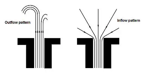 - Jet driven streaming: Periodic suction and ejection of a viscous fluid through an orifice or a change in cross section. The mechanism relies on the fact that a viscous fluid behaves quite differently during the suction and ejection periods. During the suction period the flow comes from all kind of directions, whilst during the ejection period a jet is produced. In Figure 2, the outflow and inflow patterns at the transition between a small tube and open space are shown. These two outflows can be regarded as the superposition of a broadly distributed oscillating flow and a time-averaged toroidal circulation.Figure 2: Outflow and inflow patterns