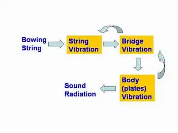 When a violinist bows a string, which can produce vibrations with abundant harmonics. The vibrations of the strings are structurally transmitted to the bridge and the body of the instrument through the bridge. The bridge transmits the vibrational energy produced by the strings to the body through its feet, further triggering the vibration of body. The vibration of the body determines sound radiation and sound quality, along with the resonance of the cavity.