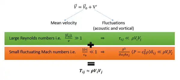 where is the so-called Lighthill's stress tensor , further details are provided in the next section. with: is the intertial stress tensor of Reynolds is the viscous stress tensor of Reynolds represents all effects due to entropy non-homogeneities (important for hot jets with high temperature gradients)