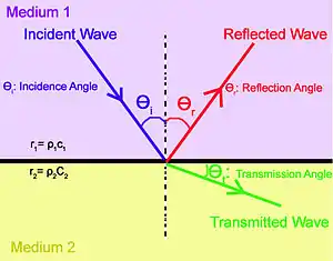 For fluids only, the sound reflection coefficient is defined in terms of the incidence angle and the characteristic impedance of the two media as [3]:
