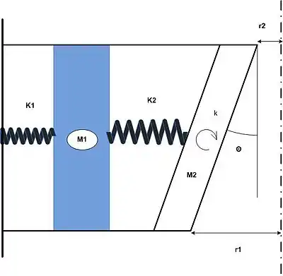 The motion of vocal fold can be described with two degrees of freedom. First rotation of mass M2 and displacement r. The equation of motion will be: