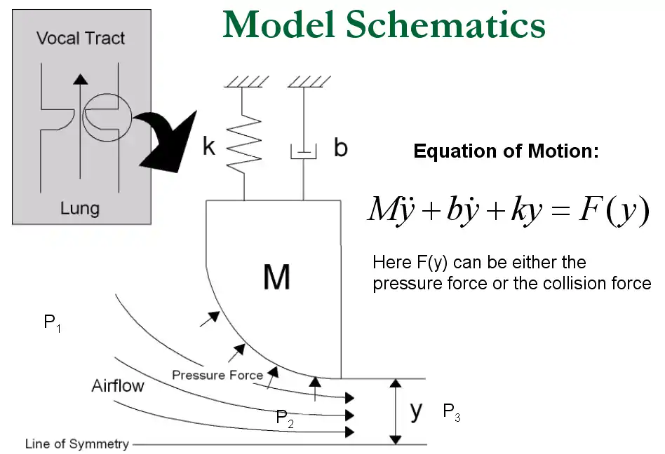 This flow-induced oscillation, as with many fluid mechanics problems, is not an easy problem to model. Numerous attempts to model the oscillation of vocal folds have been made, ranging from a single mass-spring-damper system to finite element models. In this page I would like to use my single-mass model to explain the basic physics behind the oscillation of a vocal fold.