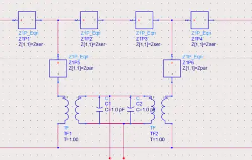Mason’s Crossed-Field model was used to develop the equivalent electrical circuit for an one period of IDT fingers[7]. Frequency dependent resistance blocks were used. Resistance is minimum for the center frequency of the SAW device, and very high for remaining frequencies. Thus, the input energy propagates only at the frequencies in near the resonant frequency. The equivalent circuit below is implemented using ADS.