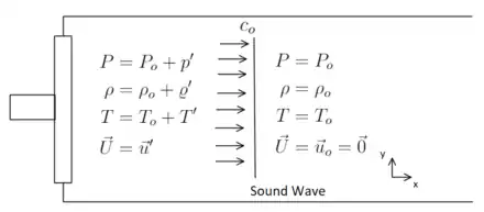 Let's consider a planar wave traveling in the x-direction inside a tube filled with a fluid at rest () with constant pressure, density and temperature (, , and , respectively). As the wave moves through the fluid at a speed, , it creates infinitesimally small fluctuations in the initially stagnant fluid in front. All four quantities describing the fluid vary around their mean value, increasing or decreasing depending on whether the fluid is being compressed or expanded. To obtain a relation for the propagating speed, , an inertial frame of reference is used and a control volume is drawn around the wave.