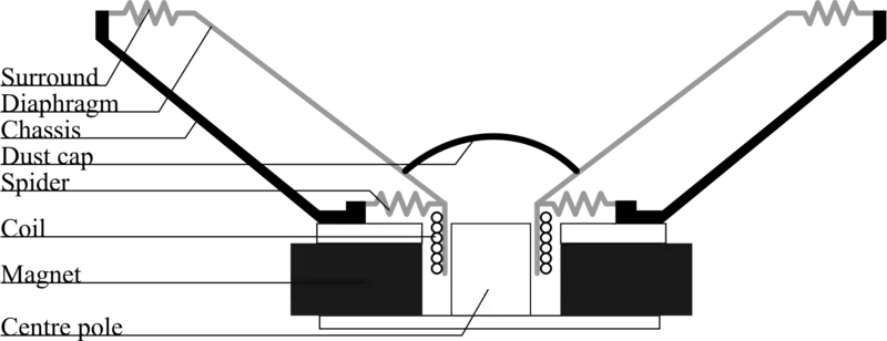 The following illustration shows a cut-away view of a typical moving coil-permanent magnet loudspeaker. A coil is mechanically coupled to a diaphragm, also called cone, and rests in a fixed magnetic field produced by a magnet. When an electrical current flows through the coil, a corresponding magnetic field is emitted, interacting with the fixed field of the magnet and thus applying a force to the coil, pushing it away or towards the magnet. Since the cone is mechanically coupled to the coil, it will push or pull the air it is facing, causing pressure changes and emitting a sound wave.