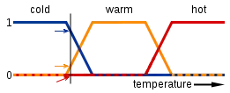 In this image, cold, warm, and hot are functions mapping a temperature scale. A point on that scale has three "truth values" — one for each of the three functions. For the particular temperature illustrated with the vertical line, the three truth values could be interpreted as describing the temperature as, say, "fairly cold" (blue arrow), "slightly warm" (yellow arrow), and "not hot" (red arrow).