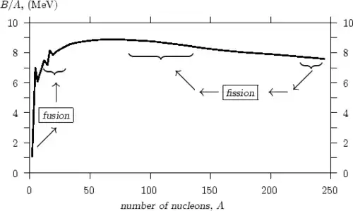Fig. 15.3 shows the dependence of the binding energy per nucleon on the number of nucleons constituting a nucleus. As you see, the curve reaches the maximum value of MeV per nucleon at around . The nuclei with such number of nucleons cannot produce energy neither through fusion nor through fission. They are kind of ashes and cannot serve as a fuel. In contrast to them, very light nuclei, when fused with each other, make more tightly bound products as well as very heavy nuclei do when split up in lighter fragments.